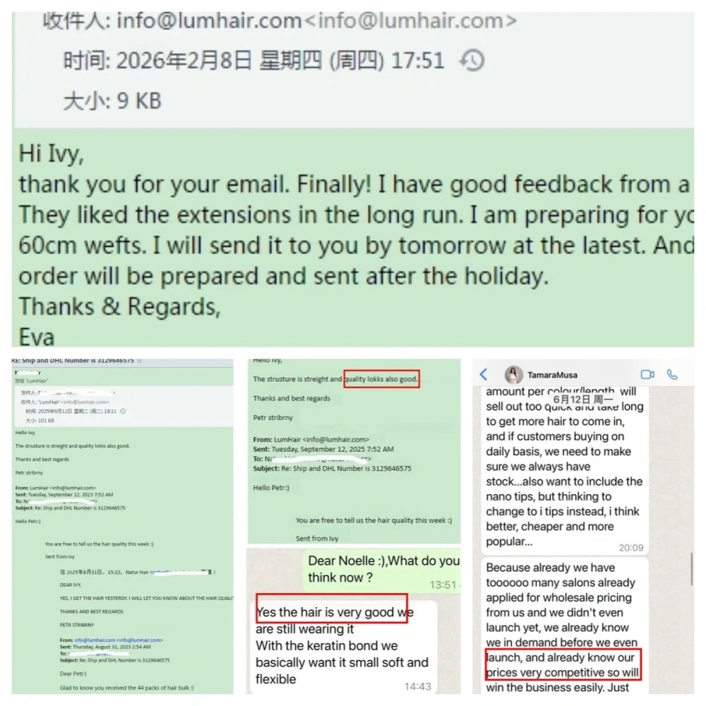 ينتشر عملاء Lum Hair في جميع أنحاء المملكة المتحدة والولايات المتحدة الأمريكية وكندا وأستراليا والدنمارك ونيوزيلندا والنرويج وألمانيا وفرنسا وهولندا والسويد وبولندا وجمهورية التشيك وسلوفاكيا وغيرها. تستطيع Ivy، بصفتها مديرة المبيعات، التحدث باللغة الإنجليزية بطلاقة من أجل التواصل الجيد.